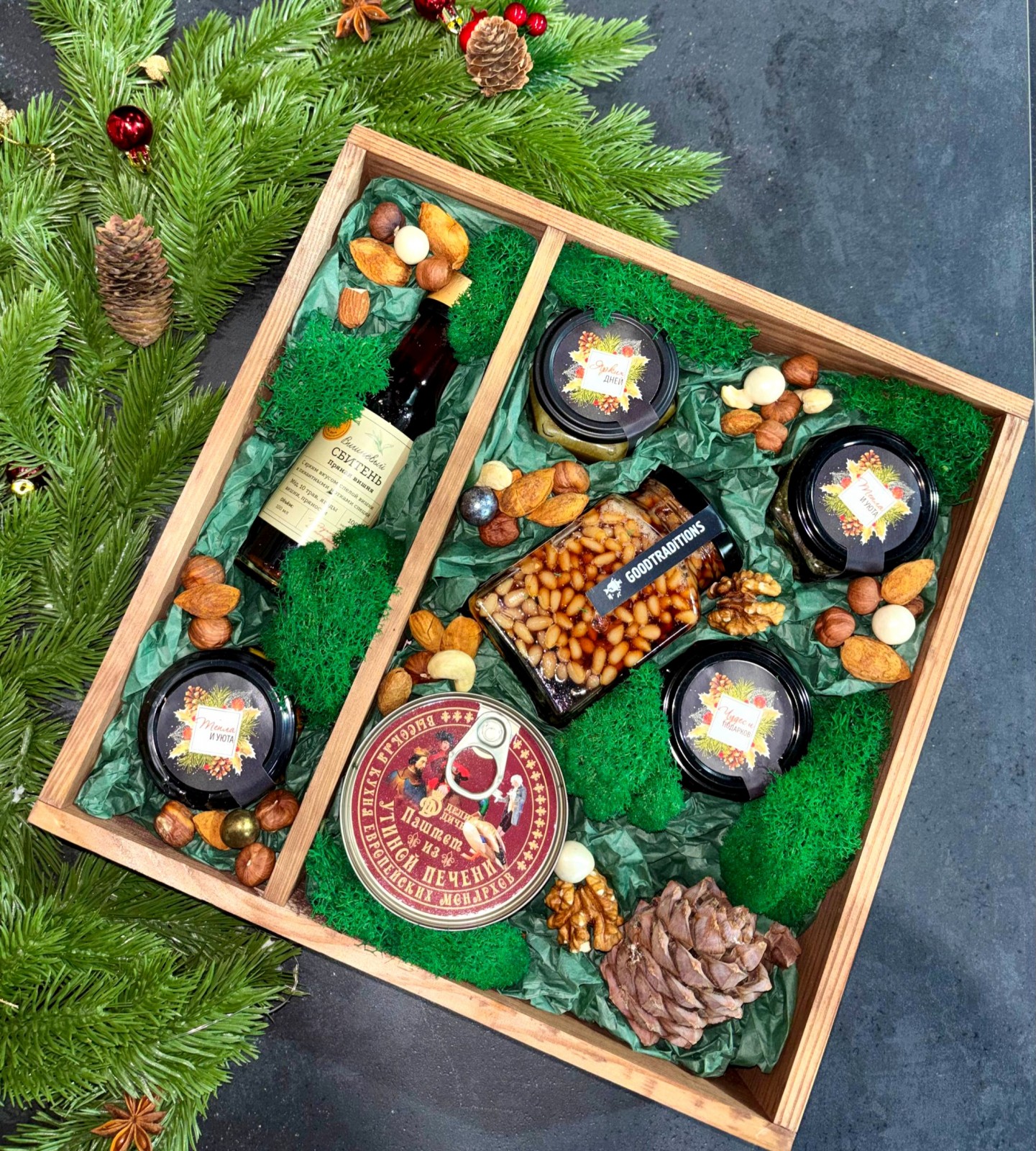 Подарочный набор в деревянной коробке с прозрачной крышкой, украшенной атласной лентой, размер 30*30*7см