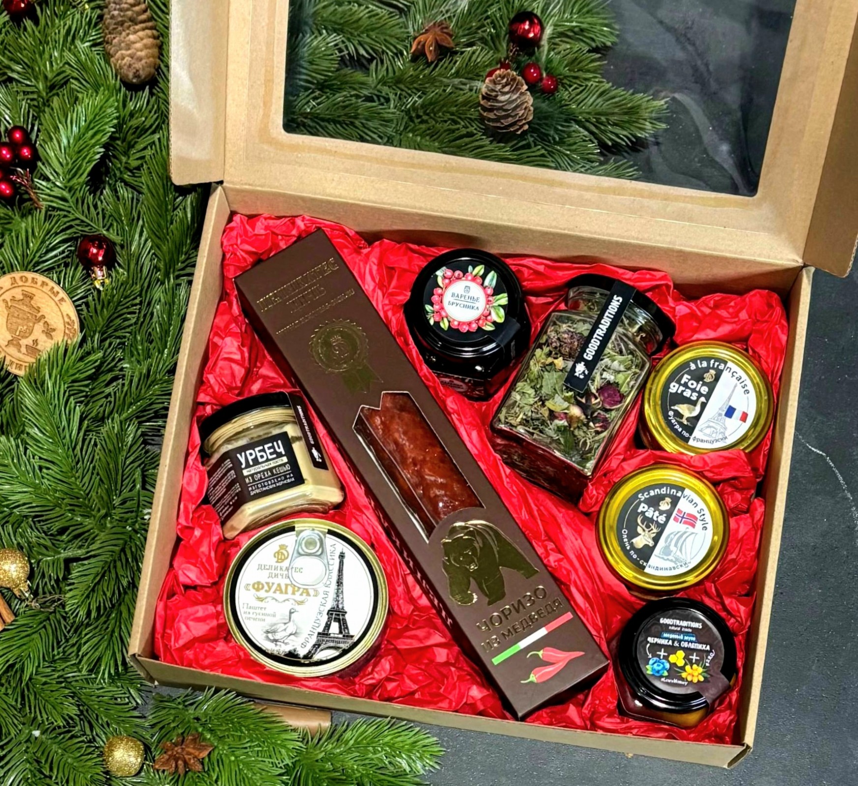 Подарочный набор в коробке крафт с окном, украшенной атласной лентой, размер 30*25*7см