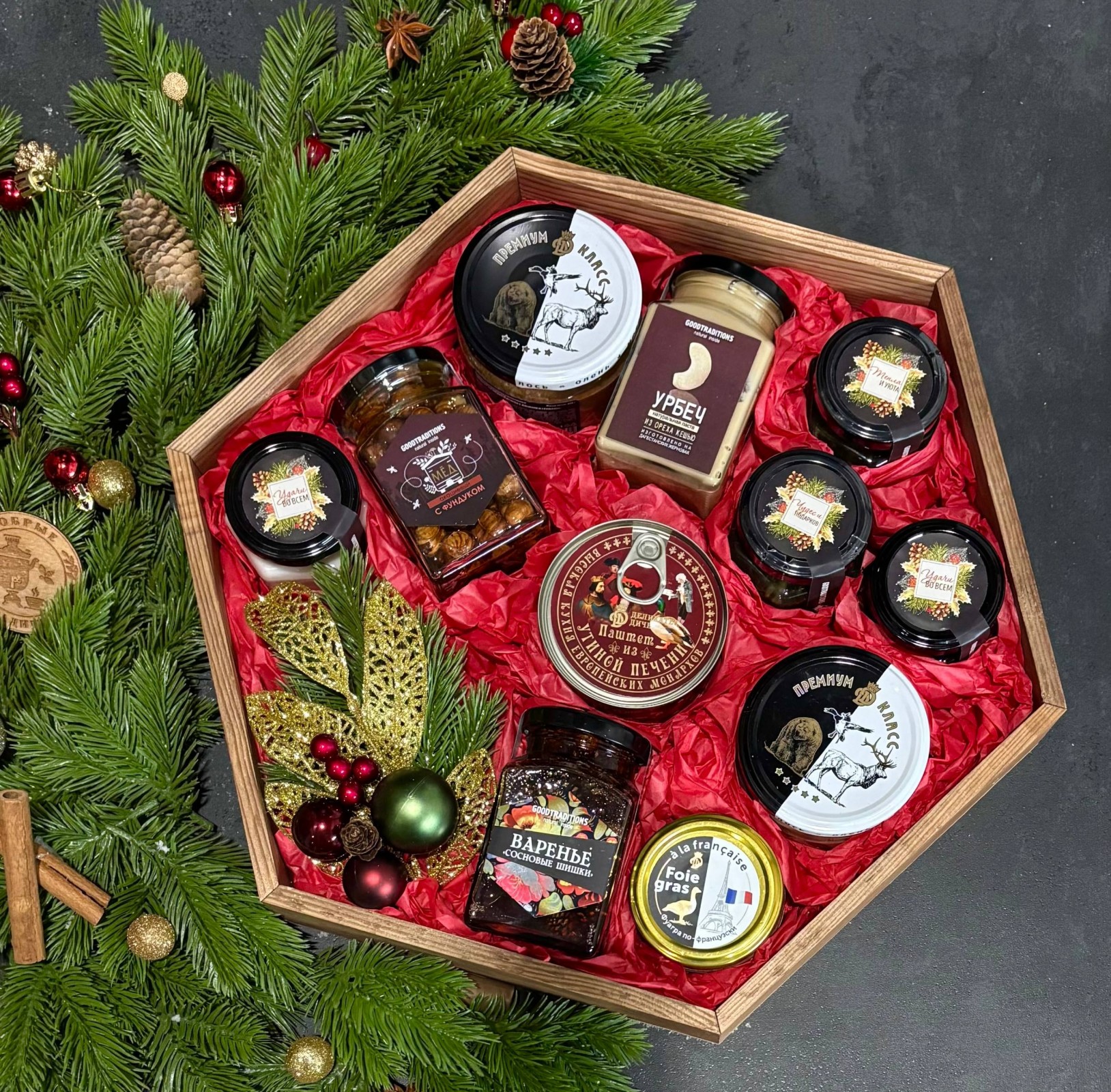 Подарочный набор в деревянной коробке шестигранник с прозрачной крышкой, украшенной атласной лентой, размер 40*40*7см