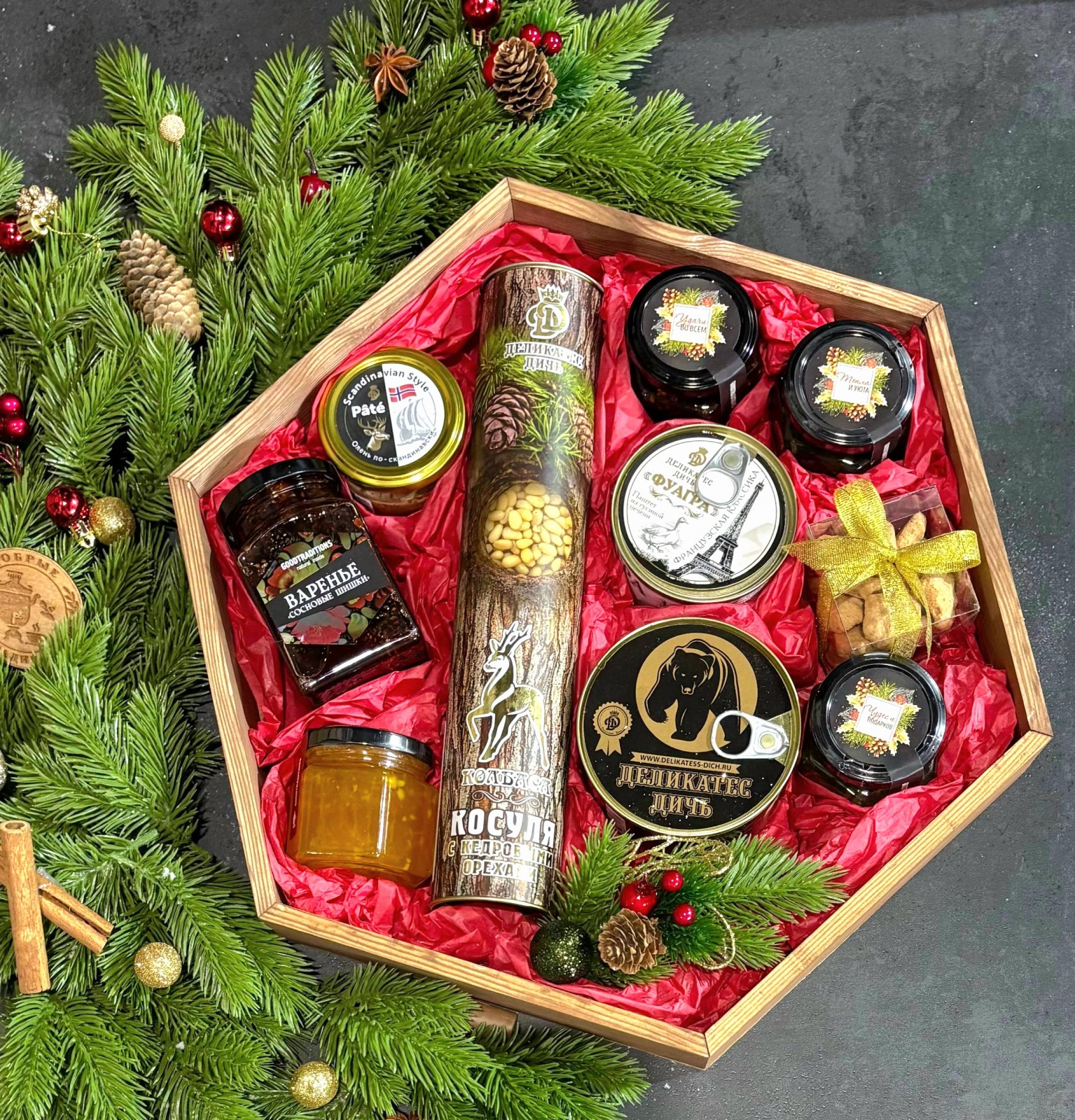 Подарочный набор в деревянной коробке шестигранник с прозрачной крышкой, украшенной атласной лентой, размер 40*40*7см